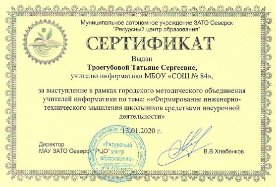 | Консультация с выступлением на семинаре проблемно-творческой группы (творческий отчет) на тему "Формирование инженерно-технического мышления школьников средствами внеурочной деятельности" (в рамках аттестации) | 11-12.09.2017 |